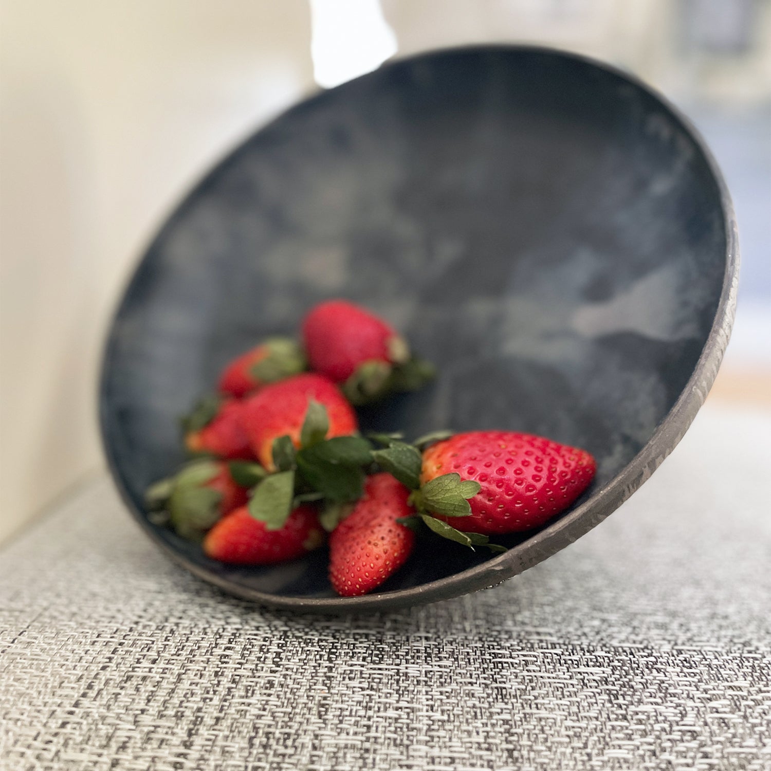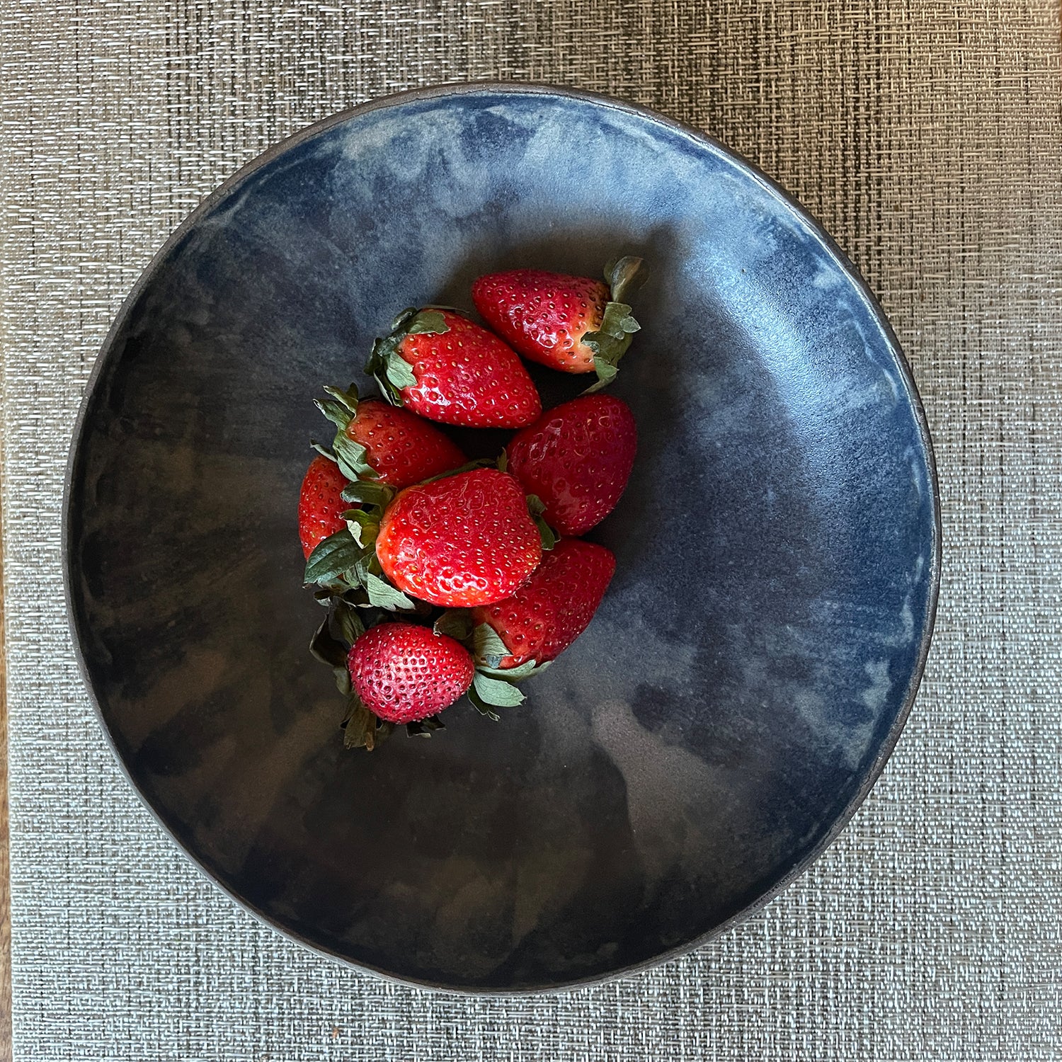 I’ve thoroughly enjoyed the process of creating this pedestal bowl. Elevating the traditional bowl form not only adds a touch of elegance but also makes it a perfect piece for entertaining. While it’s versatile enough to serve anything, cherries remain a crowd favorite in this sweet, raised shape. The interior features a dark, mottled blue glaze, while the exterior showcases black underglaze applied over a wax resist design, creating contrast and visual depth.