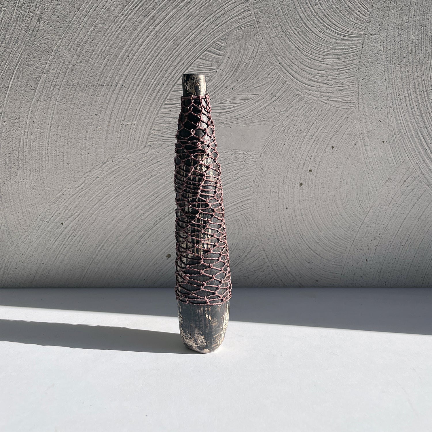 Dark clay with black and white strokes wax resist. Black waxed linen stitched in looping technique over the vase.
