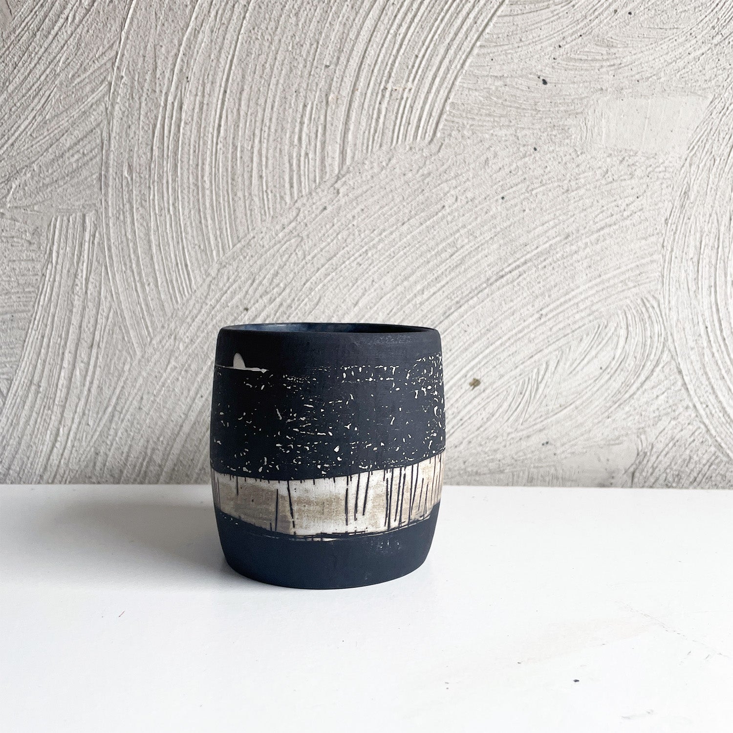 The freedom of glazing without structure invites unexpected discoveries. In this new series, bold blacks and traces of white a forging a dynamic interplay between spontaneity and control. Acai/Black read like a deep blueinterior.