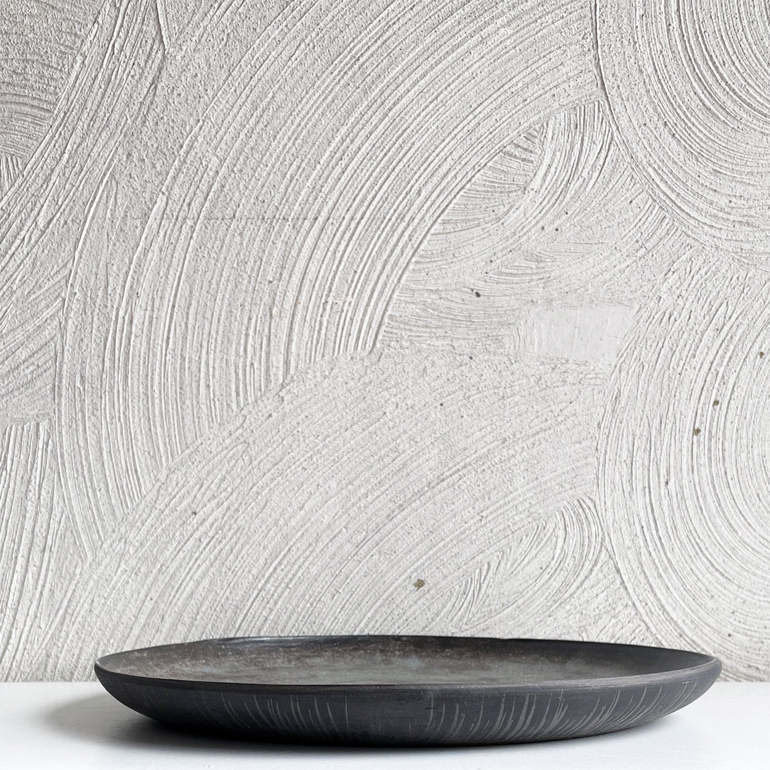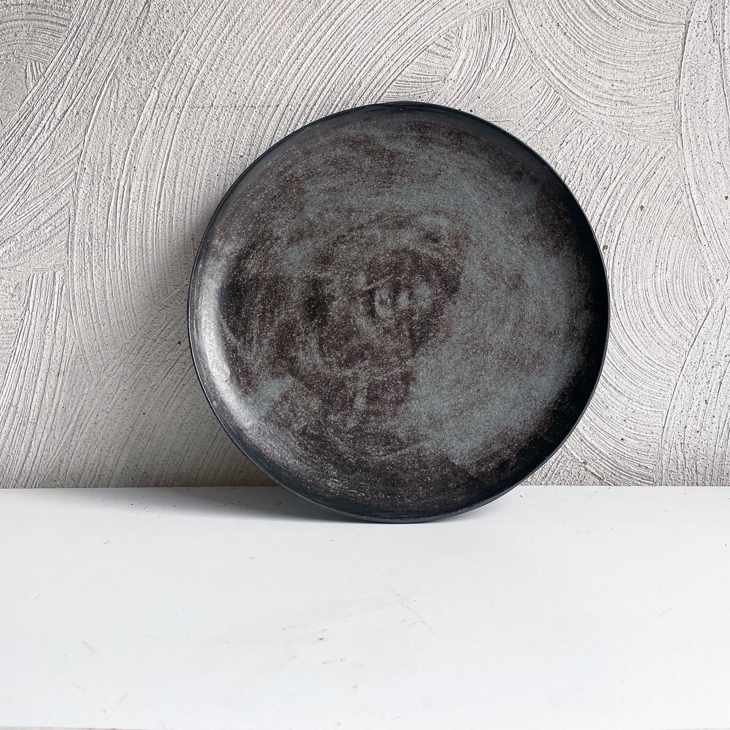 Everyday charger. Açai glaze with black underglaze on dark clay outside.