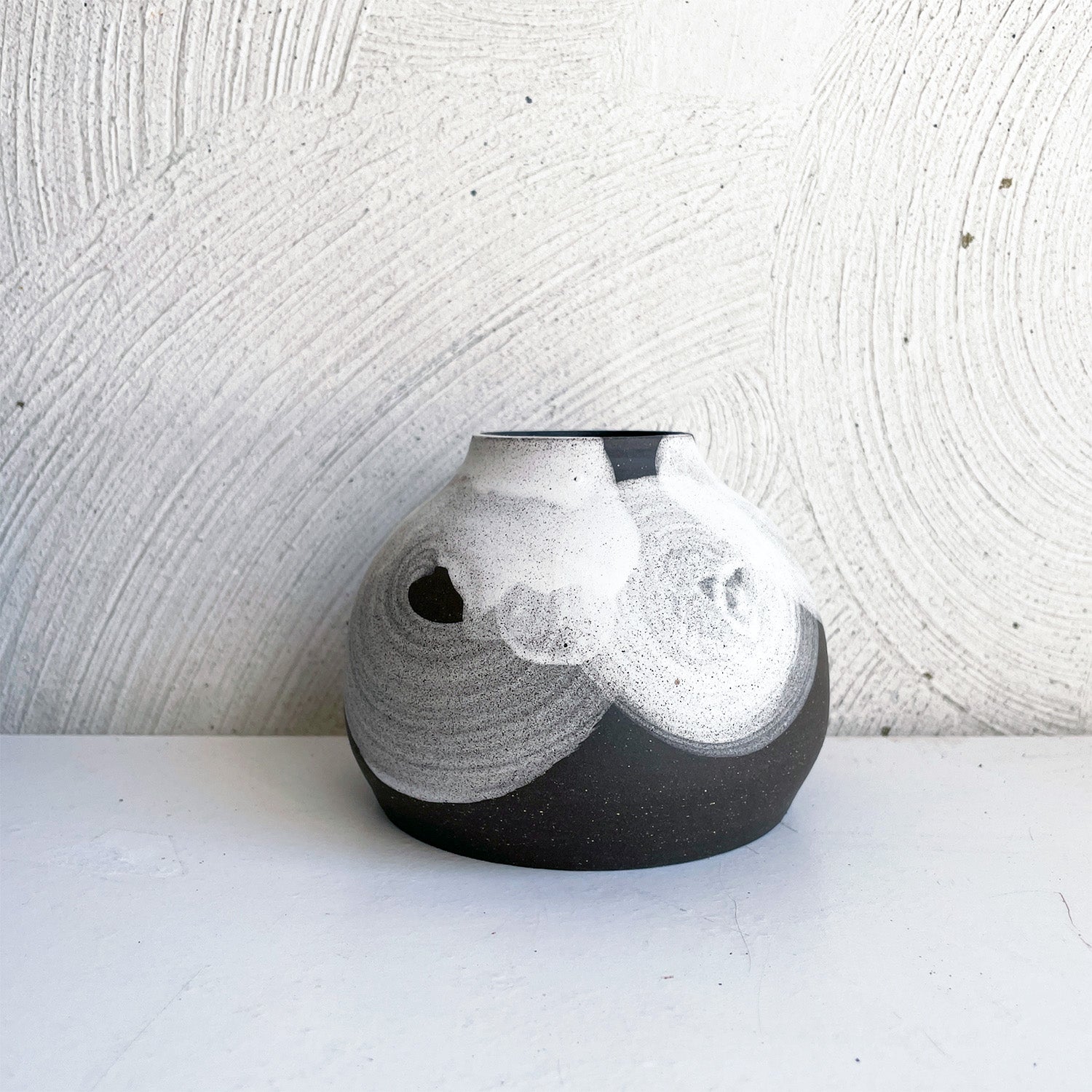 New circle series using various techniques to highlight the form. This sweet vase narrows gracefully to hold a small bunch of spring delights. White underglaze outside and satin black inside.
