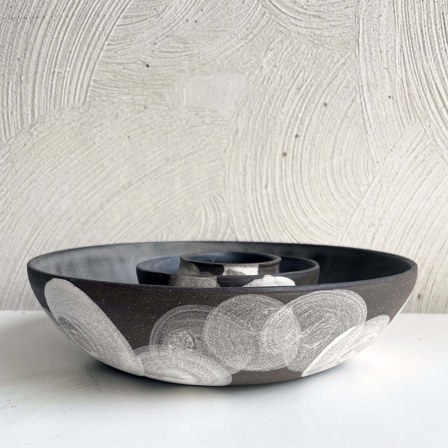 Continuing the Cloud series, this elegant serving bowl captures the ethereal essence of its namesake. Shown here alongside a selection of smaller pieces from the collection, it brings sculptural serenity to any setting.