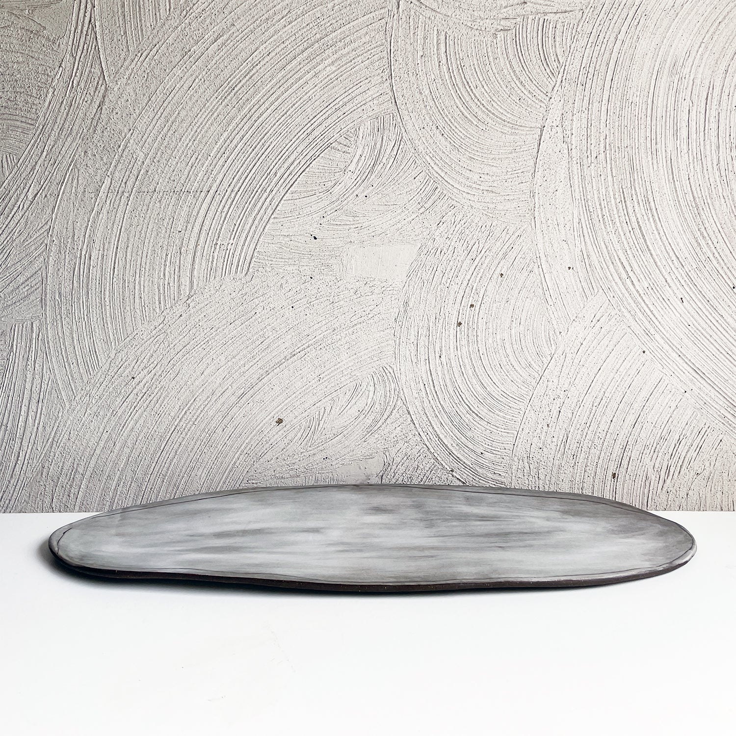 Irregular shape for display or serving. Platters are a wonderful backdrop for creative entertaining. This simple shape, dark clay with satin white showing and a hint of light grey.